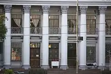 The building is built in a shape of the letter E composed of the main entrance, which is the middle part, and of the wings on both sides of the center. The prominent feature of the central section are wide steps that lead to colonnades of about three-story high and with Corinthian capitals on the upper portion.[7]