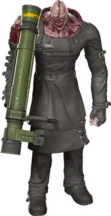 Nemesis' appearance was designed by Yoshinori Matsushita, with Aoyama instructing him to create "a rough guy who attacks with weapons and has an intimidating build" in order to heighten the fear of being pursued.[4] who drafted several early takes on the character. Although some elements remained consistent among them, the early designs featured several different degrees of surface damage as well as different options for clothing, such as a protective vest instead of a coat, or a nude design similar to the original Tyrant.[15] Clothed in black trousers, an overcoat, boots, and gloves, the Nemesis is armed with a rocket launcher mounted on its left arm.[18] A parasite was added to help further characterize it.[4] To emphasize its design as a prototype, the game developers left exposed muscles on its body and added stitches to cover its right eye. It lacks lips and a nose whatsoever, with the underneath facial muscles and teeth completely exposed. As Nemesis is damaged its appearance does not change as drastically as previous Tyrants, due to Matsushita wanting to keep him visually different from Resident Evil 2's William Birkin in this regard.[4]