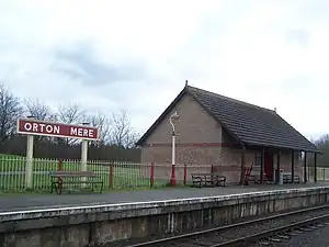 Overton (for Ferry Meadows) is located near the site of Orton Waterville station and provides access to the nearby country park. The current building was moved brick by brick from the old goods yard at Fletton Junction on the East Coast Main Line; it replaced a portable building desperately in need of repair. NVR has now added a canopy. The station building was offered to the NVR for £1 plus transportation costs. The Park is open throughout the year, but most facilities such as the miniature railway and pedaloes only run from Easter to the end of October. The station is also the site of the new Night Mail Museum, with construction well under way with some exhibits open to view.[2] Overton station was renamed Overton 'for Ferry Meadows' in 2017 in conjunction with the Nene Valley Railway's 40th anniversary celebrations.[3]