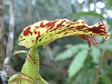 Nepenthes naga is a tropical pitcher plant endemic to the Barisan Mountains of Sumatra. It is characterised by a forked sub-apical appendage on the underside of the lid and an undulate lid margin.[2] The specific epithet naga is the Indonesian word for "dragon" and refers to the distinctive lid appendage of this species as well as the large size of its pitchers. The name also references local folklore, which tells of dragons occurring in this species's habitat in the past.[2]