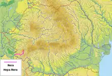 The Nera (Romanian: Nera; Serbian: Нера, romanized: Nera; Hungarian: Néra) is a 124-kilometre-long (77-mile) river running through Romania and Serbia. It is a left tributary of the Danube,[1][2] which it joins near Banatska Palanka. Its length is 143 km (89 mi) and its basin size is 1,380 km2 (530 sq mi) (Black Sea drainage basin).[2] The Nera is not navigable.