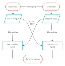Unlike a local game where the inputs of all players are executed instantly in the same simulation or instance of the game, in an online game there are several parallel simulations (one for each player) where the inputs from their respective players are received instantly, while the inputs for the same frame from other players arrive with a certain delay (greater or lesser depending on the physical distance between the players, the quality and speed of the players' network connections, etc.).[3] During an online match, games must receive and process players' input within a certain time for each frame (equal to 16.66 ms per frame at 60 FPS), and if a remote player's input of a particular frame (for example, of frame number 10) arrives when another one is already running (for example, in frame number 20, 166.66 ms later), desynchronization between player simulations is produced. There are two main solutions to resolving this conflict and making the game run smoothly:
