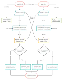 An alternative system to the previous netcode is rollback netcode. This system immediately runs the inputs of the local player (so that they are not delayed as with delay-based netcode), as if it were an offline game, and predicts the inputs of the remote player or players instead of waiting for them (assuming they will make the same input as the one in the previous tick). Once these remote inputs arrive (suppose, e.g., 45 ms later), the game can act in two ways: if the prediction is correct, the game continues as-is, in a totally continuous way; if the prediction was incorrect, the game state is reverted and gameplay continues from the corrected state, seen as a "jump" to the other player or players (equivalent to 45 ms, following the example).[1] Some games utilize a hybrid solution in order to disguise these "jumps" (which can become problematic as latency between players grows, as there is less and less time to react to other players' actions) with a fixed input delay and then rollback being used. Rollback is quite effective at concealing lag spikes or other issues related to inconsistencies in the users' connections, as predictions are often correct and players do not even notice. Nevertheless, this system can be troublesome whenever a client's game slows down (usually due to overheating), since rift problems can be caused leading to an exchange of tickets between machines at unequal rates. This generates visual glitches that interrupt the gameplay of those players that receive inputs at a slower pace, while the player whose game is slowed down will have an advantage over the rest by receiving inputs from others at a normal rate (this is known as one-sided rollback).[6] To address this uneven input flow (and consequently, an uneven frame flow as well), there are standard solutions such as waiting for the late entries to arrive to all machines (similar to the delay-based netcode model) or more ingenious solutions as the one currently used in Skullgirls, which consists of the systematic omission of one frame every seven so that when the game encounters the problem in question it can recover the skipped frames in order to gradually synchronize the instances of the games on the various machines.[7]