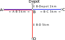 - Both lines begin at point A, and run on a common route 5 km (3.1 mi) long to point B.