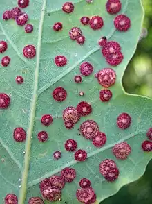 Several different spangle type galls are found on oak leaves so close inspection is required for proper identification.[5]