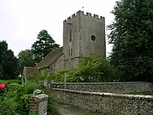 From the car park the trail takes the causeway across the Rother floodplain towards the Tudor ruins of Cowdray House, but turns right on reaching the river to skirt round St Anne's Hill, once the site of a Norman castle, and crosses a bridge at the former Midhurst canal wharf, once the western terminus of the Rother Navigation. Passing the former wharfinger's cottage the trail follows the south bank of the river before turning south across country to the small village of Heyshott, birthplace of reformer and peace campaigner Richard Cobden who is buried in nearby West Lavington churchyard. Passing the ancient parish church of St James before leaving the public highway the trail then climbs the steep South Downs escarpment to the trail's highest point on Heyshott Down at 225 metres (738 ft) where it crosses the South Downs Way. The trail now descends the gentler slopes through Singleton Forest and then crosses open ground at Levin Down to Singleton on the River Lavant. In this largely flint built village the Saxon parish church with its massive squat tower was a hundredal church. A doorway from the tower into the nave shows that there was once an upper floor to the nave.[4]