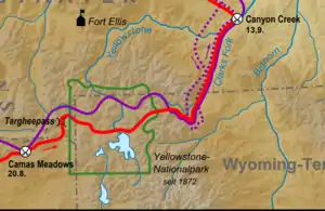 On August 20, 1877, the Nez Perce and the U.S. Army engaged again at the Battle of Camas Creek[3] just west of Henrys Lake, Idaho. The Nez Perce raided a camp of soldiers, stealing mostly mules and a few horses and supplies. The ensuing fight lasted a full day, but resulted in few casualties. On the evening of the 20th, the Nez Perce headed east, crossed Red Rock Pass[4] leaving Idaho into Montana then entering Yellowstone National Park and Wyoming near the present-day west entrance 44°39′44″N 111°06′15″W / 44.66222°N 111.10417°W[5] on August 23, 1877. General Howard's Bannock scouts and White scout Stanton G. Fisher followed the Nez Perce a day behind. They reported back to Howard and he predicted correctly that the Nez Perce's objective was to cross the Yellowstone plateau and then head for the Crow agency on the Yellowstone River.[6] Howard's command was exhausted and did not immediately pursue the Nez Perce into the park, electing to remain in the vicinity of Henry's Lake to regroup.