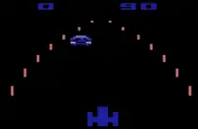 Atari released a port for the Atari VCS (later renamed to the Atari 2600) in 1980. It was programmed by Rob Fulop,[18] who added color, displaying the player vehicle, additional vehicles the player must avoid, and showing houses and trees along the sides of the road. The paddle controller steers the vehicle; holding the button accelerates.[19] It is not possible to shift gears in this version. There are eight variations, some of which are timed and the player tries to score as much as they can in 90 seconds.[20]