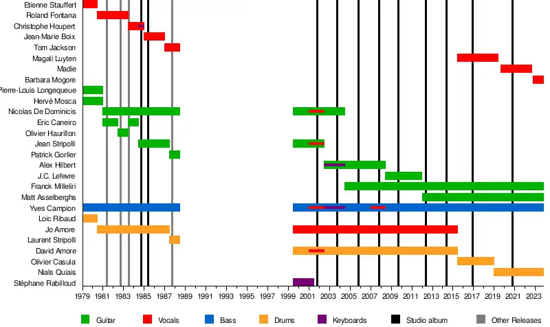 | Past members | Madie Christophe Houpert Jean-Marie Boix Magali Luyten Tom Jackson Nicolas De Dominicis Jean Stripolli Alex Hilbert Stéphane Rabilloud JC "Jess" Lefevre Jo Amore David Amore Olivier Casula |