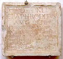 A nomenclator (/ˈnoʊmən.kleɪtər/ NOH-mən-KLAY-tər; English plural nomenclators, Latin plural nomenclatores; derived from the Latin nomen- name + calare – to call), in classical times, referred to a slave whose duty was to recall the names of persons his master met during a political campaign.[1] Later, the scope was expanded to include names of people in any social context and also other socially important information about them.[2]