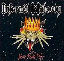 None Shall Defy is the debut album by Infernäl Mäjesty. It was originally released in 1987 by Roadrunner Records and re-issued in 1996 on cd by Displeased Records with bonus tracks originally appearing on their "Nigresent Dissolution" Demo in 1988.[1]