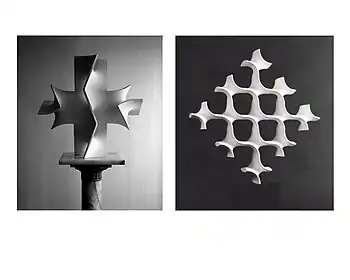 Carlberg's sculptures often consist of repetitions of such a unit, a basic shape capable of combining with other such elements in various ways—somewhat in the way a composer such as Bach or Webern might compose a piece of music by exploring the combinatorial possibilities of a single motivic cell, working within implicit constraints. At Yale, Erwin Hauer was an important influence who prodded Carlberg in this stylistic direction. While both men often employed curvilinear forms as modules, Carlberg more often used relatively geometric, hard-edged design units, often combining curves with straight edges (or flat planes) in the same module. His prints, mostly dating after 1970, show a similar preoccupation with precision, simplicity, and modularity. Some are actually groups of prints, placed contiguously together on a wall, with each print conceived as a module.[10]