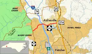 NC 146 begins its western end at NC 191 in the community of Avery Creek[2] a census-designated place (CDP) south of Asheville. NC 146 travels east and at just over 1.5 miles (2.4 km), immediately after crossing the French Broad River, intersects Interstate 26/U.S. 74 at exit 37. Passing exit 37, NC 146 enters the Asheville city limits and passes north of Lake Julian and Julian Lake Park before nearing its eastern end. At 3.51 miles (5.65 km), NC 146 reaches its eastern end at U.S. Route 25 in Skyland (but still within the Asheville city limits).[2]