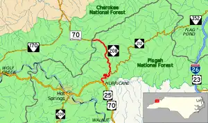 NC 208 is a 9.1-mile (14.6 km) two-lane mountain highway that begins in the community of Hurricane and goes north hugging the banks of Big Laural Creek and (after a curved bridge) Shelton Laural Creek. Once at Belva, the highway goes northwest towards Greeneville, Tennessee, passing through the community of Allenstand, before reaching the state line at Allen Gap (2,234 ft (681 m), highest point on route). Just beyond the state line, the Appalachian Trail crosses the highway.[1] The entire highway is within the confines of the Pisgah National Forest.