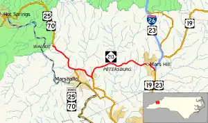 Established in 1928 as a renumbering of NC 69 from US 70/NC 20 in Marshall to US 19/NC 69 near Forks of Ivy. In 1930, NC 213 was realigned around Petersburg leaving behind several secondary roads; also in the same year the highway was extended west onto new routing through Canto and renumbered NC 63 to Trust.[2] In 1934, NC 213 was rerouted northeast from Mars Hill to intersect with US 19/US 23 replacing NC 31, while the route to Forks of Ivy was replaced by NC 36.[3] By 1947, NC 213 was pushed back onto a new realignment of NC 36 near California Creek Road. In 1951, NC 213 was truncated west again in Marshall dropping to Canto and NC 63 regaining its original link to Trust.[4]