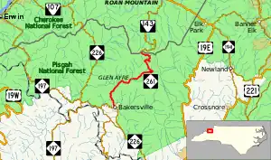 NC 261 begins in the town of Bakersville, the county seat of Mitchell County, at a stop-controlled T-intersection with NC 226 (Crimson Laurel Way). It immediately climbs a short hill out of the town and into the Pisgah National Forest. As it starts to head in a northeastern general direction, NC 261 begins a winding course between the Cub Creek and Pumpkin Patch Mountain. After crossing Pumpkin Patch Gap (elevation approximately 3,140 feet (960 m)), the road begins to follow the Little Rock Creek and pass through the communities of Cookstown and Glen Ayre. three miles (4.8 km) outside of Glen Ayre, after paralleling more streams, NC 261 starts a climb up to Roan Mountain. Afters some hairpin turns, the road reaches Carvers Gap (elevation 5,500 feet (1,680 m)) where the state line and Appalachian Trail crosses the road. Tennessee SR 143 continues ahead towards the community of Roan Mountain.[1][2][3]