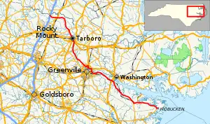 North Carolina Highway 33 (NC 33) is a primary state highway in the U.S. state of North Carolina. Spanning a distance of 110 miles (180 km), the east–west route passes through many small towns and communities in Eastern North Carolina's Inner Banks. It bypasses a large portion of the cities of Rocky Mount and Greenville, and goes through central Tarboro.
