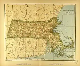 The northern boundary of the U.S. state of Massachusetts adjoins two other states: Vermont and New Hampshire. The majority of the boundary is roughly a straight line from the northwest corner of the state (42°44′44.7″N 73°15′54.13″W / 42.745750°N 73.2650361°W NAD27[1]) east to a point in Dracut, just north of Lowell. East of that point, the border is a series of line segments about 3 miles (5 km) north of the curving Merrimack River, ending in the Atlantic Ocean.