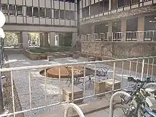 A critically acclaimed example of modern architecture, built as part of a renovation linking Vincent and Murphy Halls together, and located between the two buildings. The design, created by landscape architect Roger Martin with support from University Architect, Winston Close, and Head of the university's School of Architecture, Ralph Rapson, replaced an earlier concept by the architecture-engineering firm Toltz, King & Day, who were in charge of building the connections between the two buildings, that was considered to be less sophisticated. No evidence exists about the condition and usage of the space prior to its construction. The courtyard's furnishings, circulation, and recessed design is meant to invoke a sense of peacefulness, unique from the rest of the campus. A 15-foot diameter dome-shaped fountain made of concrete is set in the middle of the space with a jet of water flowing from the top and down the sides; the initial jet reaching a height of three feet and eight inches, and meant to be visible when entering.[62]
