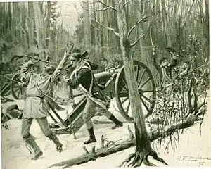 Upon learning that negotiations had failed, Wayne advanced, reaching Fort Jefferson on October 13 with 2,600 men.[126] On October 17, an Odawa war party under Little Otter attacked a supply convoy south of Fort Jefferson, killing fifteen and capturing ten.[127] Wayne was compelled to use more troops to guard his supply line. Given these problems, Wayne decided to halt major operations and build Fort Greenville north of Fort Jefferson. "I am at a loss to determine what the savages are about, and where they are," he wrote to Knox in November.[128] The Natives were having logistical problems of their own, with many warriors scattering for the winter hunt.[129] The Legion wintered at Fort Greenville, but on December 23 Wayne led a detachment of about 300 men to the site of St. Clair's defeat. There, his troops built Fort Recovery, buried the American dead still on the battlefield, and recovered three of the cannon lost there in 1791.[130][131]