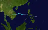Typhoons Iris, Joan, and Kate made landfalls on Vietnam within a 12-day period in November.[6]: 74 The first storm, Iris, may have developed from a tropical disturbance east of Samar as early as October 31 according to tracking data from the Japan Meteorological Agency (JMA).[7] Weather observations detected the system, named Iris, as it tracked westward South China Sea in early November.[6]: 78 Iris strengthened into a low-end typhoon with one-minute maximum sustained winds of 120 km/h (75 mph) on October 4 as estimated by the Joint Typhoon Warning Center (JTWC) shortly before moving ashore South Vietnam near Qui Nhơn. The storm weakened quickly over the rough terrain of Southeast Asia, and dissipated inland on November 5.[7][6]: 78
