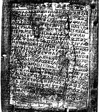The Novgorod Codex (Russian: Новгородский кодекс) is the oldest book of Kievan Rus', unearthed on 13 July 2000 in Novgorod. It is a palimpsest consisting of three bound wooden tablets containing four pages filled with wax, on which its former owner wrote down dozens, probably hundreds of texts during two or three decades, each time wiping out the preceding text.