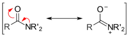 Another factor that plays a role in determining the reactivity of acyl compounds is resonance. Amides exhibit two main resonance forms. Both are major contributors to the overall structure, so much so that the amide bond between the carbonyl carbon and the amide nitrogen has significant double bond character. The energy barrier for rotation about an amide bond is 75–85 kJ/mol (18–20 kcal/mol), much larger than values observed for normal single bonds. For example, the C–C bond in ethane has an energy barrier of only 12 kJ/mol (3 kcal/mol).[3] Once a nucleophile attacks and a tetrahedral intermediate is formed, the energetically favorable resonance effect is lost. This helps explain why amides are one of the least reactive acyl derivatives.[4]