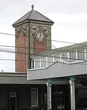 The original Nuneaton station was opened on 15 September 1847, when the London and North Western Railway (LNWR) opened the Trent Valley Line; the branch line to Coventry opened in 1850. The original station, like many others on the line, had been designed by John William Livock. A simple two platform structure, it became inadequate to cope with the growing traffic, and was rebuilt on a larger scale with extra platforms in 1873. It was rebuilt and enlarged again in 1915, with its current buildings, which were designed by Reginald Wynn Owen. The most prominent feature of which is the clock tower.[1][2]
