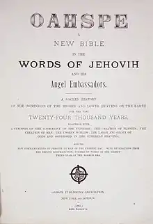 Oahspe: A New Bible is a book published in 1882, purporting to contain "new revelations" from "...the Embassadors of the angel hosts of heaven prepared and revealed unto man in the name of Jehovih..."[1] It was produced by an American dentist, John Ballou Newbrough (1828–1891),[2] who reported it to have been written by automatic writing, making it one of a number of 19th-century spiritualist works attributed to that practice.[3] The text defines adherents of the disciplines expounded in Oahspe as "Faithists".[4]