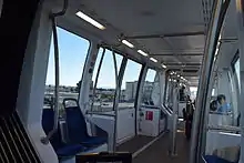 The Oakland Airport Connector AGT system is operated by BART and is integrated into BART's existing fare system. However, it does not utilize existing BART rolling stock and it is not physically connected with existing BART tracks. Instead it has its own fleet of AGT vehicles that operate on fixed guideways and are cable-drawn. The guideways and Cable Liner vehicles were built by Doppelmayr Cable Car. The line is designed to have an approximate headway of 4.5 minutes (though it is currently operated with a headway of 6 minutes) and to complete a one-way trip in approximately 8 minutes, with an on-time performance of more than 99.5%.[6][7] The initial setup is four 3-car trains (113 passengers each train),[8] but the system can accommodate an expansion to four 4-car trains (148 passengers each train).