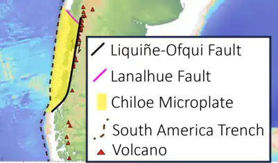 Chiloe Microplate, also known as Chiloe Block, is a forearc sliver that detached along the Liquine Ofqui Fault.[58] It is bounded by Arauco Peninsula and Chile Triple Junction.[58] The sliver moves northward with a motion rate ranges from 32 mm per year in the south to 13 mm per year in the north.[58] This northward motion not only caused by the oblique subduction of the Nazca Plate, but also the oblique collision and spreading of the Chile Rise at the southern edge of the sliver.[58]