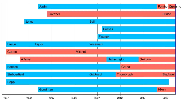 This graphical timeline depicts the length of each current judge's tenure (but not seniority) on the Court: