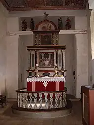 At some point, the western wall of the church was replaced and a window was installed instead of a door, making a door on the south side of the church the main entrance. During the 18th century, a new porch was built at the south door. The choir originally had open rafters, but received a flat ceiling in 1713–1714. Rosemåling was painted by Thomas Blix on the interior walls during this time too. A new altarpiece was installed in 1732.[6]