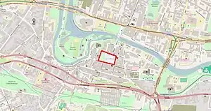 In 1617, a permanent community of Jesuits was established in the city, thanks to the support of inhabitants and the action of Father Jan Kuczborski, Bishop of Chełmno since 1614.[10] They received ownership of several tenements standing at the Market Square, where they rebuilt a residence and a school. Thanks to many funding (Bydgoszcz city council, bishop Kasper Działyński, the Polish Chancellor and Jerzy Ossoliński, Bydgoszcz Starosta), the Jesuit community expanded its facility. The area is delimited today by the Old Market Square to the east, Farna Street to the north, Jezuicka Street to the west and Niedźwiedzia Street to the south. Between 1637 and 1649, along the western frontage of current Old Market place was built the Holy Cross church, adorned with two towers in 1655 and 1695. In 1653, the residential building was completed; in 1780, it housed a high school, elevated to the rank of Jesuit College. The ensemble also featured a theater hall for cultural activities, which had been used until the Municipal Theater was created in 1814. The complex was gradually expanded and embellished throughout the 17th and 18th centuries, and became at the time the hallmark of the place and the entire city.[10] In 1804, the church was re-consecrated as St. Ignatius of Loyola Church in Bydgoszcz.