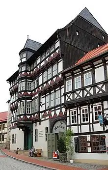 The building has a solidly built ground floor above which rise three timber-framed storeys whose facade is asymmetrically designed. The two uppermost storeys are jetties, i.e. storeys that project beyond the one below. The top storey has inflexed arches. One feature of the building are its polygonal oriel windows. These oriel windows, also built in a timber-framed style, are supported on decorated corbels and project out over the eaves of the house. The building is covered with a steeply-pitched gable roof. The main entranceway is designed as a semi-circular arch and has Late Gothic mullions. The house measures 23.5 metres high, is 18 metres wide and 14 metres deep.