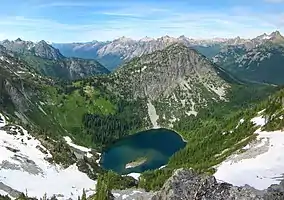 Elevations around the area range from 780 feet (240 m) above sea level at the mouth of the Okanogan River to 6,774 feet (2,065 m) above sea level at the Moses Mountain.[36] The average elevation is 843 feet (257 m) above sea level according to the United States Geological Survey (USGS). The Moses Mountain, with a summit, sits east of the city,[37] while Little Moses Mountain, located 5,963 feet (1,818 m) above sea level, and Omak Mountain, located 5,749 feet (1,752 m) above sea level, are adjacent to the Moses Mountain.[36] West of the city are the North Cascades, anchored by the Cascade Range.[23] Mountain peaks on the western portion of the Omak area range between 6,000 feet (1,800 m) and 8,000 feet (2,400 m).[38] The Coleman Butte mountain summit—1,450 feet (440 m) above sea level—is located directly adjacent to municipal boundaries.[39][40]