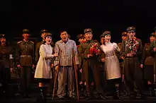According to Kim, Sea of Blood, the production of which he oversaw in 1971, is the exemplar of a perfect opera.[14] Because Sea of Blood preceded the publication of On the Art of Opera, it is likely that Kim was in the process of systematizing his thought at the time.[lower-alpha 1] Sea of Blood was quickly followed by four similar operas:[30] A True Daughter of the Party (1971), The Flower Girl (1972), Tell O' The Forest! (1972), and The Song of Mount Kumgang (1973), all of which according to Kim are either written by or otherwise closely associated with Kim Il Sung.[31] These are collectively known in North Korea as the "Five Great Revolutionary Operas".[32]