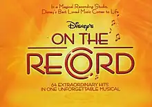 On the Record (sometimes referred to as Disney's On the Record) is a jukebox musical[1] revue featuring many classic songs from a variety of live action and animated films and television series produced by Walt Disney Pictures, Broadway musical plays produced by Walt Disney Theatrical, and even Disneyland attractions. This theatrical celebration of 75 years of Disney music tells the story of four singers recording a greatest hits album in a magical recording studio.[2] After opening in Cleveland in 2004, the production toured for nine months, visiting 24 cities in the United States before closing in Denver in mid-2005.[3]