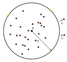 The algorithm uses forward search method with random initialization, where the radius is determined by the maximum distance of the object, any given ball should capture. After the centers are determined, for any given test object the distance can be calculated as,