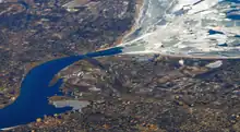 East of the Murphy Road underpass, the freeway curves to the northeast to bypass its original alignment.[11] It crosses the Howard Watson Nature Trail, a mixed-use recreational trail that was converted from a Canadian National Railway (CNR) line in 1988.[12] The highway curves back to its east–west orientation at an interchange with Highway 40 (Modeland Road).[11] It passes south of Sarnia Chris Hadfield Airport before exiting the city limits at Mandaumin Road (Lambton Road 26).[13]