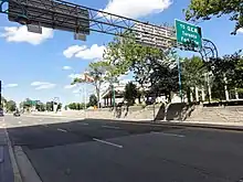 East of the QEW, Highway 420 encounters an interchange with Dorchester Road as both cross the Queenston-Chippawa Power Canal.[7] This interchange was originally a traffic circle that was removed in the early 1970s.[8] The numerous lanes from the QEW interchange to the west begin to converge between residential subdivisions east of Dorchester Road, gradually narrowing to four through lanes at the Drummond Road interchange.[7] After passing beneath Portage Road, the route widens on approach to an at-grade intersection with Stanley Avenue. This intersection is the eastern end of both the freeway segment of the route and the signed King's Highway 420; east of Stanley Avenue the route is signed as Niagara Regional Road 420 and known as Falls Avenue.[9][10]