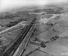 Meanwhile, McQuesten was overseeing construction of the QEW between Toronto and Fort Erie. The new dual highway, inspired by German Autobahns, was the first of its kind in Canada.[lower-alpha 1] The outbreak of World War II in September 1939 temporarily halted McQuesten's ambitions, as funding was quickly shifted to the war effort. As a result, construction on the new superhighway was put on hold south of Niagara Falls. McQuesten officially opened the QEW on August 23, 1940; the pavement ended south of Lundy's Lane.[18] Despite the war, work began on a link between the opened QEW and the Rainbow Bridge through the centre of Niagara Falls. This link would not be completed in time for the opening of the new bridge.[19]