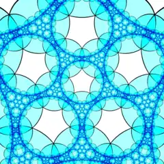 In the geometry of hyperbolic 3-space, the order-7 icosahedral honeycomb is a regular space-filling tessellation (or honeycomb) with Schläfli symbol {3,5,7}. It has seven icosahedra, {3,5}, around each edge. All vertices are ultra-ideal (existing beyond the ideal boundary) with infinitely many icosahedra existing around each vertex in an order-7 pentagonal tiling vertex arrangement.