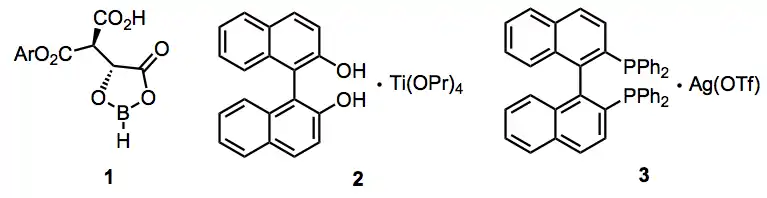 A wide variety of enantioselective additions employing chiral, non-racemic Lewis acids are known. The chiral (acyloxy)borane or "CAB" catalyst 1, titanium-BINOL system 2, and silver-BINAP system 3 provide addition products in high ee via the Lewis-acid-promoted mechanism described above.