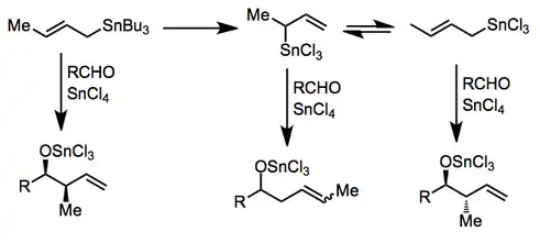 In the presence of certain Lewis acids, transmetalation may occur before addition. Complex reaction mixtures may result if transmetalation is not complete or if an equilibrium between allylic isomers exists. Tin(IV) chloride[7] and indium(III) chloride[8] have been employed for useful reactions in this mode.