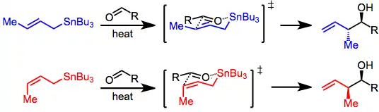 With the allylstannane and aldehyde in high-temperature conditions, addition proceeds through a six-membered, cyclic transition state, with the tin center serving as an organizing element. The configuration of the double bond in the allylstannane controls the sense of diastereoselectivity of the reaction.[4]