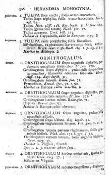 - 1 2 Linnaeus 1753, Vol. 1. Hexandria Monogynia pp. 306–308.