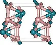 Three osmium borides are known: OsB, Os2B3 and OsB2. The first two have hexagonal structure,[2] similar to that of rhenium diboride. Osmium diboride was first also sought as hexagonal,[3] but one of its phases was later reassigned to orthorhombic.[1][4] In recent methods of synthesis, it has also been found that a hexagonal phase of OsB2 exists with a similar structure to ReB2.[5]