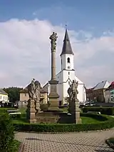 The Church of Saint Vitus was built on the site of an old wooden church in late Gothic and Renaissance styles in 1565–1568. The town hall dates from 1704, and the Marian column in the middle of the town square was built in 1720–1730. A valuable sculpture group is the Statue of the Three Saints (John, Paul and Lutgardis). It dates from 1714.[8]