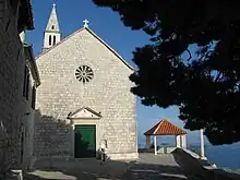 The monastery is surrounded by dense pinewood forests and is located on a craggy stone crest 152 metres above the sea.[2]It has a bird's-eye view east, south, and west over the Korčula and Pelješac sea channel with the old town of Korčula in the background. The building consists of one large floor with four outer wings. The whole building forms a unit with the church and is dominated by the bell tower. Petar Tolstoj, a Russian lord and travel writer, mentioned the monastery in 1868. German prince Philipp of Coburg stayed at the monastery in 1905, and the British writer Seaton Watson was there in 1913.